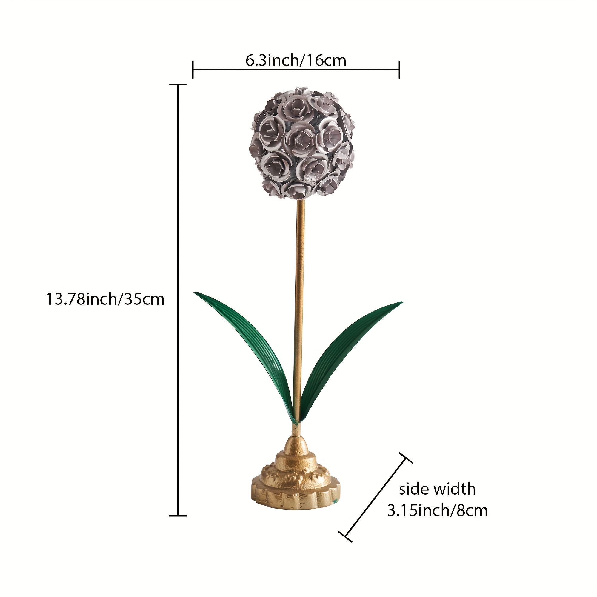 Metal Rose Ball Flower Decor with Green Leaves and Golden Base European Iron Table Ornament for Home Display